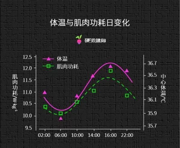 通過上述圖表我們可以看出,人體的體溫在 16:02的時候到達了最高點。這就相當于人在這個時間段內(nèi)被動熱身,使肌肉的彈性組織增加了彈性,更加不容易斷裂。所以這個時間段訓練,受傷的幾率會比其他時候小很多。