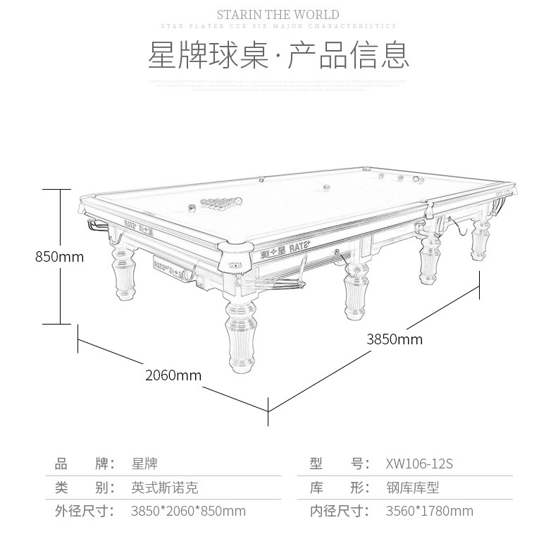 - 星牌 XW107-12S 英式斯諾克臺(tái)球桌